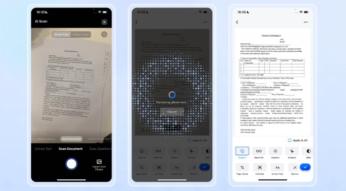 Escaneamento contínuo multiplo: Seja um livro didático extenso, um contrato com várias páginas ou folhas de anotações soltas, o usuário pode digitalizar todos os documentos de uma vez só utilizando o modo sequencial da função "Escaneamento com IA".